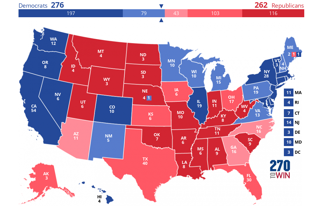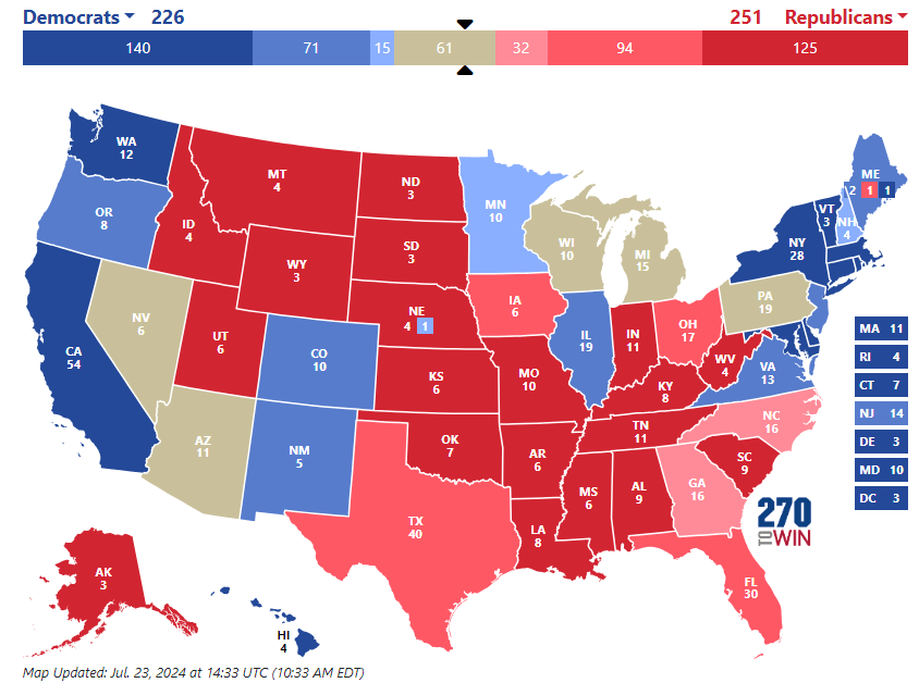 Insomma, 251 a 226 per Trump. Ai Repubblicani basta vincere solo in Pennsylvania. Oppure in Wisconsin e Arizona. Oppure in Michigan e Nevada. Harris invece deve prenderli tutti. Mancano ancora una convention e oltre 3 mesi alle elezioni del 5 novembre 2024. Cosa può fare Harris?